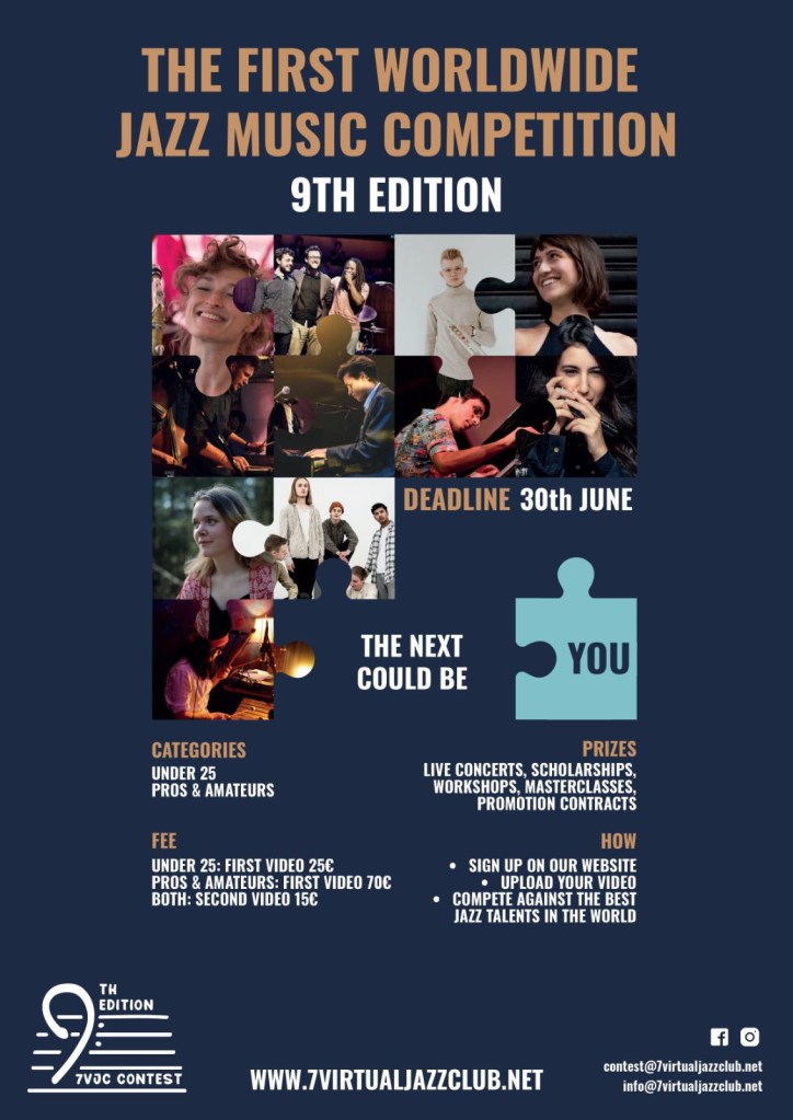 | We have started to promote our 9th edition of 7 Virtual Jazz Club’s International Contest and we’d like to propose our initiative to the students of the jazz department. Special discount for schools Jazz Teachers can make a list of 5 contestants minimum (soloists or bands) who will get a discount of 60% on the entry fee. Please, for information write an email to info@7virtualjazzclub.net Throughout the years we had winners such as Gilad Hekselman, Simon Moullier, Nicole Johanntgen, David Helbock, Daniel Zamir, Ariel Bart, Alex Hitchcock, Sandia band and more. We also launched the careers of talents such as Tommaso Perazzo, Misha-Mullov Abbado, Shekband, Nausyqa, The Jazz Fingers, Carlos Cippelletti, Bliss Quintet, Daniel Dyonisius, Ella Zirina, Sasha Berliner, Tuva Halse and more. It is a worldwide jazz music competition open to all the musicians, all ages, all countries. Deadline for Applications June 30th, 2023. Read more |