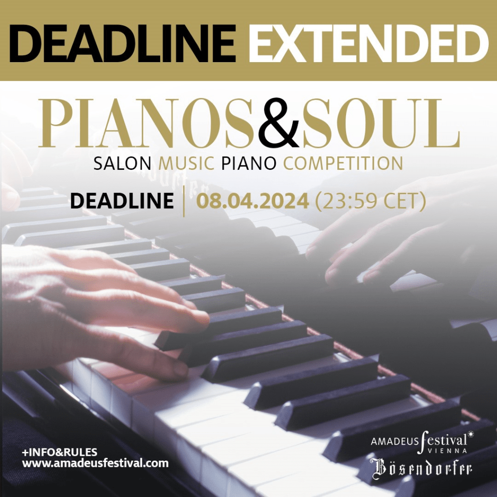 the call for the ”Pianos&Soul” Competition of the AMADEUS Festival Vienna 2024. An International Piano Competition that will reward the best young musicians (15-35 years old) and will bring back the charm of the “Salon Music Violin” in Austria.