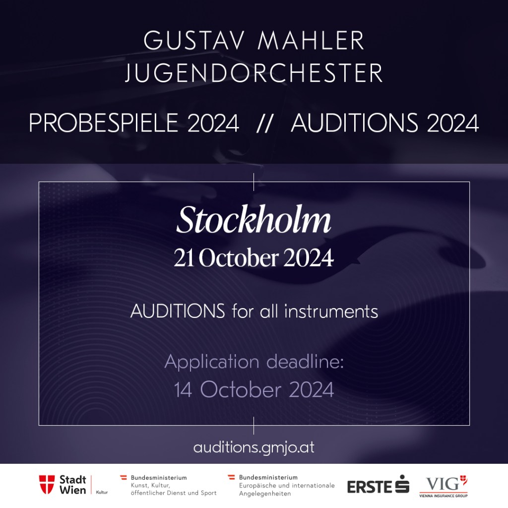 Gustav Mahler Jugendorchester Auditions 2024 – Stockholm 7 oktober, 2024 ~ Kungl. Musikhögskolans Studentkår The registration is possible here via our auditions website: https://auditions.gmjo.at/ Dela detta: Klicka för att dela på Facebook (Öppnas i ett nytt fönster) Facebook Klicka för att dela på X (Öppnas i ett nytt fönster) X Klicka för att e-posta en länk till en vän (Öppnas i ett nytt fönster) E-post Klicka för att dela via LinkedIn (Öppnas i ett nytt fönster) LinkedIn Klicka för utskrift (Öppnas i ett nytt fönster) Skriv ut Gilla Laddar in … Relaterade