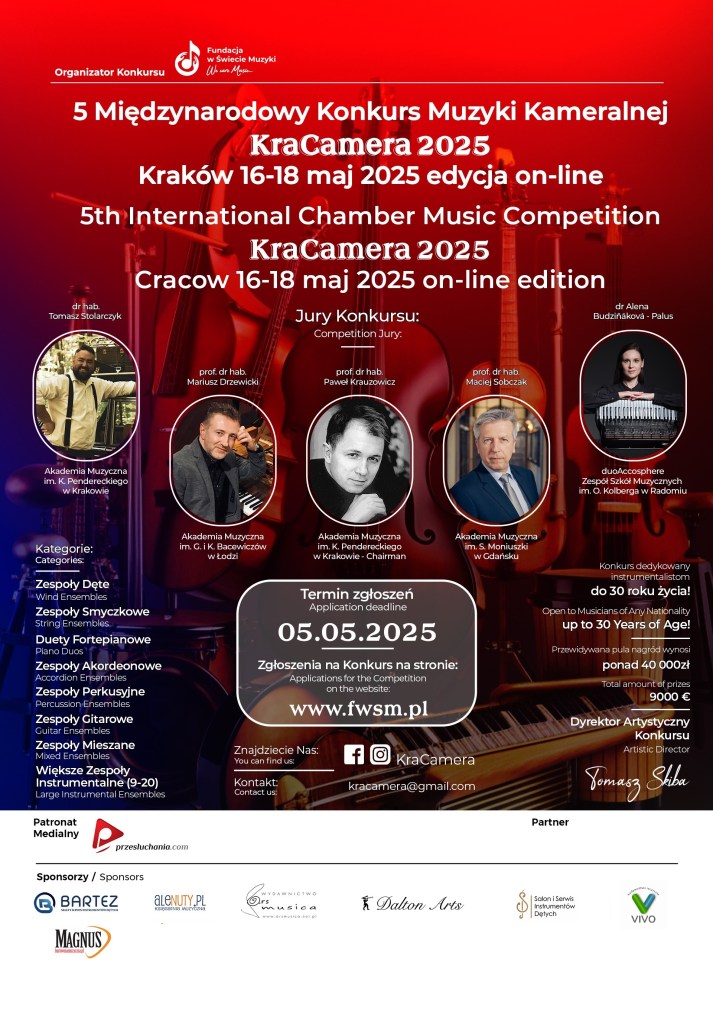 We cordially invite You to participate in the 5th International Chamber Music Competition – ”KraCamera 2024 ”, which will be held on May 16-18, 2025 in Krakow.