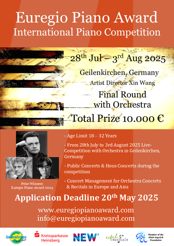13th EUREGIO PIANO AWARD 2025 – International Piano Competition APPLICATION DEADLINE: May 20th, 2025 Artistic Director: XIN WANG We are so happy to announce the 12th international piano competition ”EUREGIO PIANO AWARD” 2025 in Geilenkirchen, Germany which will be held from 28th July – 03rd Aug 2025. The Competition is open to musicians aged 18 to 32 years of any nationality regularly enrolled and is divided in 4 rounds. The Pre-Selection Round will be held in May. The Application Deadline is 20th May 2025. The 1st Round, Semifinal and Final round with Orchestra will be held in a Live-Competition in Geilenkirchen / Germany. Website Euregio Piano Award |
