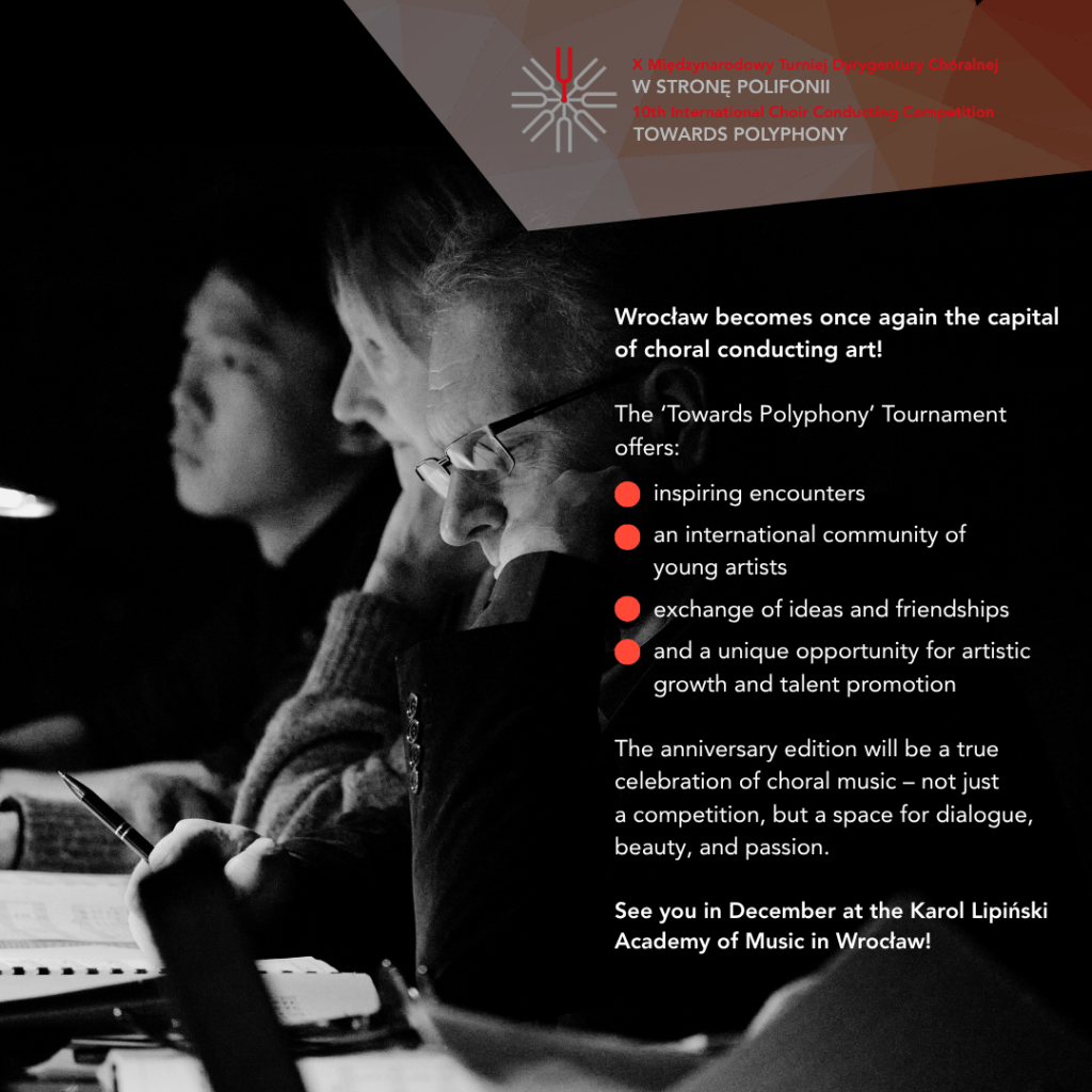 We are very pleased to announce that on 3-6 December 2025 the Karol Lipiński Academy of Music in Wrocław will be hosting the 10th International Choir Conducting Competition TOWARDS POLYPHONY for the tenth time.